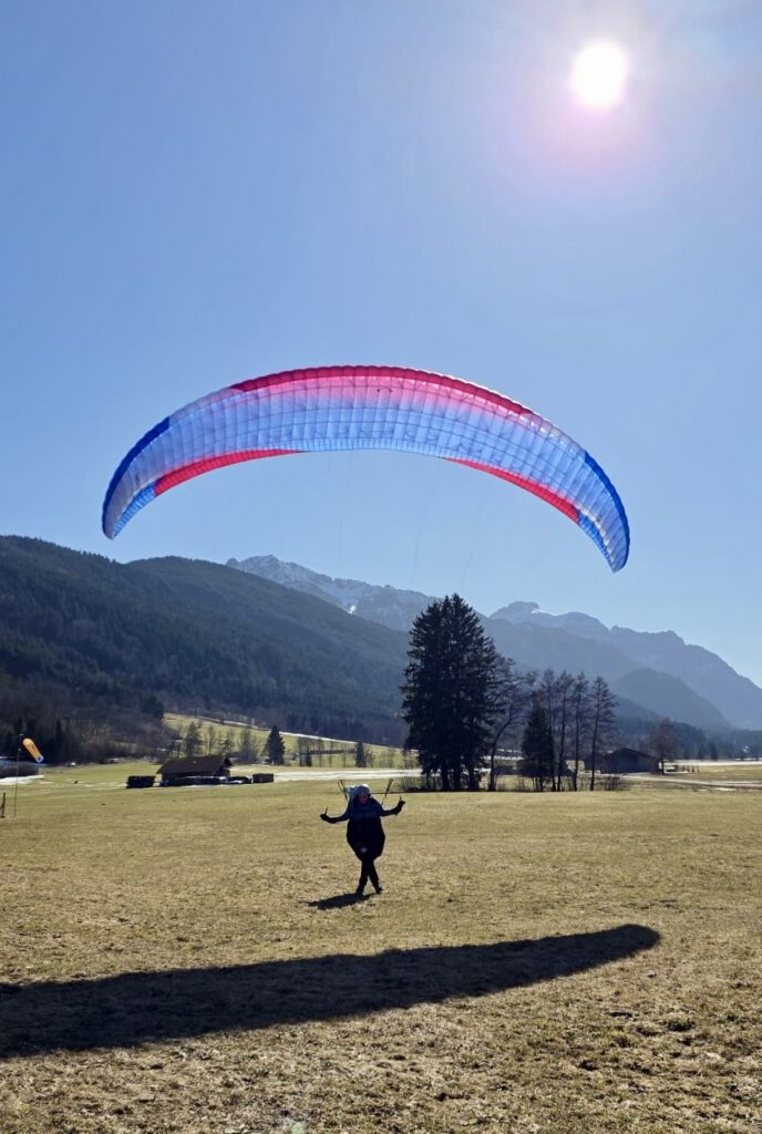 Es ist wunderschön sommerlich warm! Ich bin ein bisschen zu früh am Berg, die Thermik ist noch nicht an. Trotzdem warte ich nicht, denn ich hoffe noch auf einen zweiten Flug. Nach zähen 10 Minuten stehe ich am Boden.